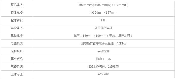 1)技術參數:2)產品特點:ü臺式結構,真空泵外置。ü高強度石英石玻璃腔體,易清潔、耐腐蝕。ü置物方式多樣化,可平放、可懸掛。ü外置環形電極,有效避免對腔體內的污染。3)應用范圍:...
