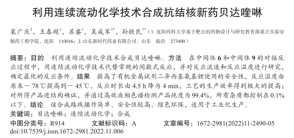歐世盛流動化學設備助力沈陽藥科大學孫鐵民團隊抗結核新藥貝達喹啉合成工藝研究